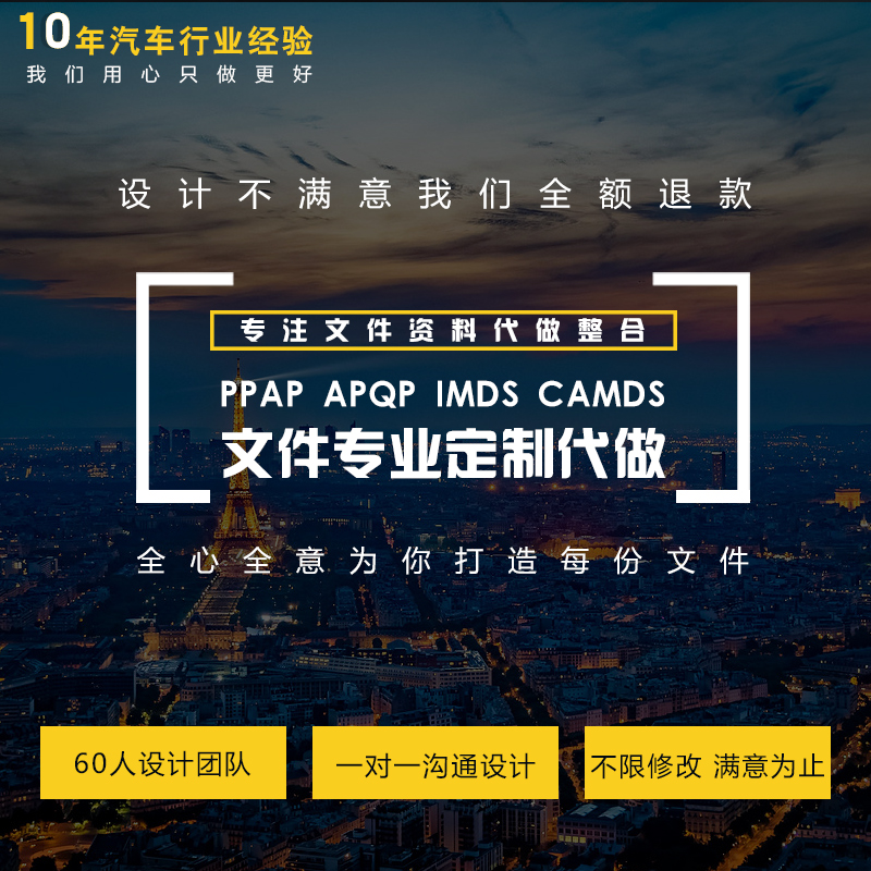 專精于五金件、注塑件、緊固件,特殊加工零件,汽車零部件等產(chǎn)品的PPAP、IMDS、CAMDS、FMEA、8D報告等技術(shù)文件輔導(dǎo)制作服務(wù)。